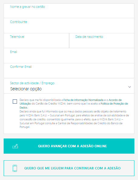 - Na página do cartão, você poderá ver as condições, bem como a documentação do mesmo. Então, é só clicar no botão “Aderir ao Wizink” para pedir o cartão escolhido e assim, abrir sua conta;