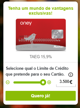 O pedido do cartão Oney Auchan, pode ser realizado online. Para isso, você deve entrar na página do cartão, escolher o limite desejado e clicar no botão “Quero já”.