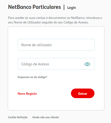 Você então será levado para a página de login no NetBanco e, caso já tenha uma conta nesta instituição, basta digitar o seu nome de utilizador e código de acesso.