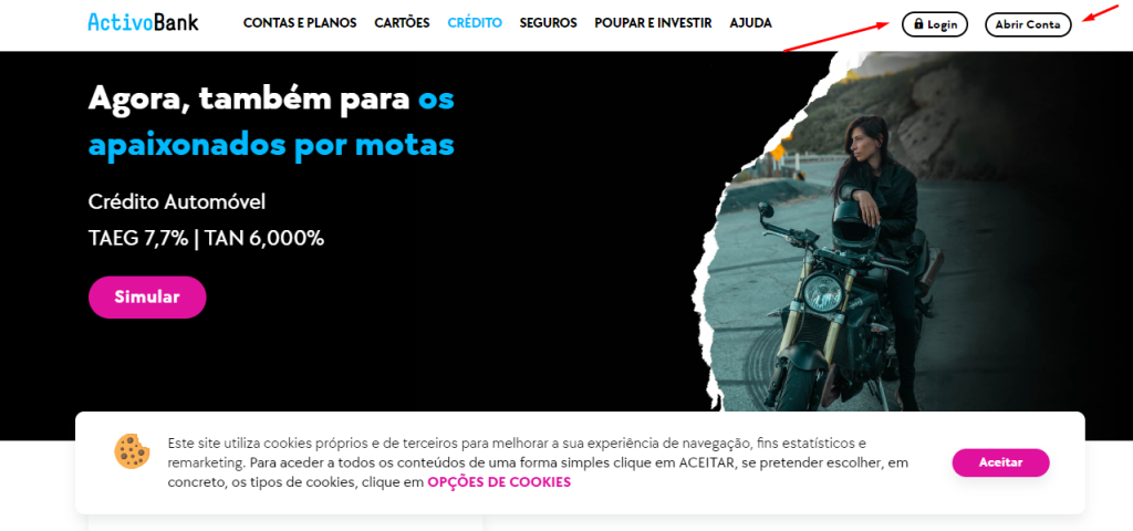 • No canto superior direito da página citada acima, basta clicar em “Login” ou “Abrir conta”;