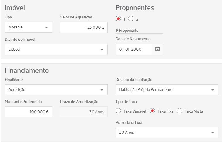• No simulador, preencha os dados solicitados, como o tipo de imóvel, valor de aquisição, o número de proponentes, o tipo de taxa desejado e o prazo;