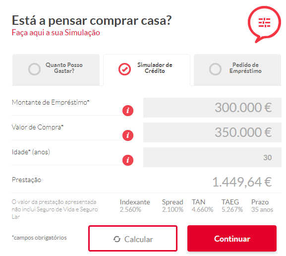 Sendo assim, basta clicar em “Simulador de crédito” e depois preencher o valor do imóvel, valor desejado e, por último, sua idade. Em seguida, o valor das taxas, bem como das prestações irá aparecer na tela.