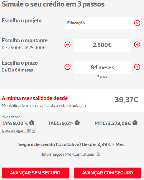 Além disso, também vale destacar que o valor oferecido pelo banco é de 2500€ e 50 000€ e o prazo de pagamento é de até 7 anos. Sendo assim, é possível obter um valor considerável e pagá-lo com comodidade e sem apertos nos próximos meses.