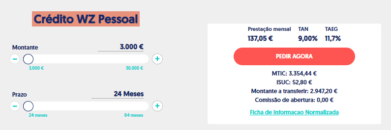 O crédito pessoal Wizink é personalizável, ou seja, você pode escolher um montante de a partir de 3.000€ até 30.000€ e um prazo de pagamento de 2 até 7 anos. Desse modo, você pode adequar o pagamento do crédito à sua situação financeira.