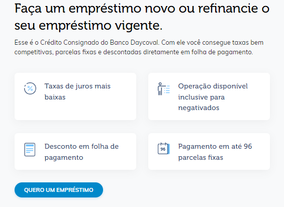 Para te ajudar com essa tarefa, listamos abaixo as vantagens do empréstimo consignado Daycoval e do empréstimo consignado Empresta Bem Melhor. Veja a seguir quais são elas: