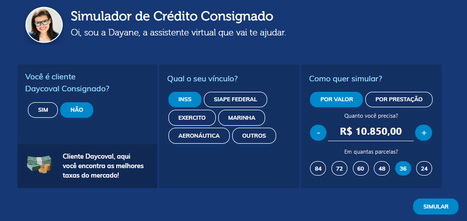 Após a simulação, o Banco Daycoval irá realizar a análise de crédito. Em caso de aprovação, você será informado e receberá o dinheiro em sua conta em pouco tempo.