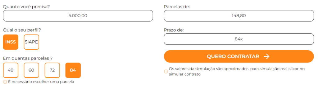 - Confira na página uma simulação do valor das parcelas e se estiver satisfeito, clique em “Quero contratar”;