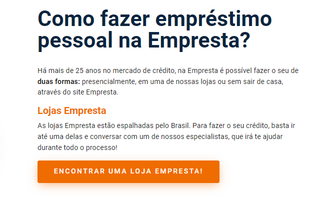 Se você preferir, também pode solicitar este empréstimo de forma presencial. Para isso, no site, clique no botão “Encontrar uma loja Empresta!”