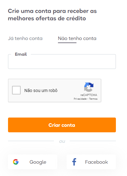- Na nova página aberta, clique em “Não tenho uma conta”, informe seu e-mail e clique no botão “Criar conta”, ou então faça login com o Google, ou Facebook;