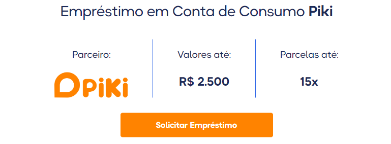 Com o empréstimo Piki, as parcelas são cobradas diretamente em uma de suas contas de consumo. Ele oferece um prazo de até 15 meses para você finalizar o pagamento e permite que você solicite até R$ 2.500.
